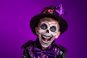 happy cheerful boy skeleton costume halloween scary gesture bright purple background celebration spooky fun trick-or-treat candy costume party trick-or-treater childhood youth fall october holiday night candy corn pumpkins bats ghosts spiders haunted house graveyard zombies witches vampires werewolves monsters costumes masks decorations partyImagine Buddy