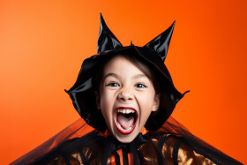 A picture of a young girl with fun halloween makeup and a dracula cape, against an orange background, halloween celebration photo