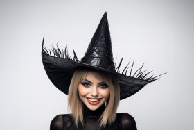 A picture of a happy young woman dressed as a witch for halloween, standing and smiling in front of a white wall, halloween celebration photo