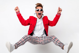 excited young man jumping white wall mouth open photo image scene joy happiness freedom energy life vitality youth athleticism fitness sports parkour free running adrenaline fun excitement adventure challenge accomplishment achievement success victory triumph celebration celebration expression emotion body language facial expression portrait photographyImagine Buddy