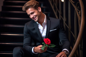 handsome young man smart jacket talking mobile phone smiling staircase bouquet roses laying near love romance dating valentine happiness joy smile happy gift flowers affection relationship couple proposal waiting surprise romantic thoughtful gentleman date night out city urban lifestyle fashion style casual attractive confident successfulImagine Buddy