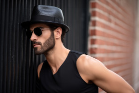 Picture of a cool young man in a black hat leaning against a wall and looking away