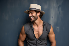 man handsome young smart casual wear fedora adjusting smile wall photo portrait fashion style urban cool confident stylish attractive model street photography headshot male urbanwear menswear outfit look streetwear trendy dapper sophisticated debonair suave gentleman guy portraiture pose expression attitude confidenceImagine Buddy