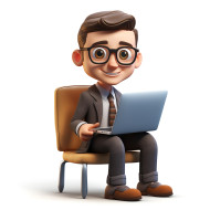 A photo of a cute young businessman character cartoon with a chair using a laptop computer, cartoon character and illustration
