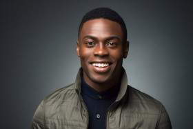 A picture of a young and good looking african man standing against a gray background he is wearing a smart casual jacket and has his hands in his pockets he is smiling