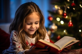 A photo of a happy mom reading a book to her daughter near a christmas tree