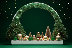 A simple photo of a christmas podium with products on it for a holiday sale, with a green background