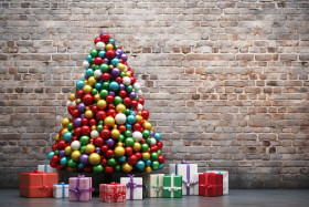 christmas tree colorful balls gift boxes white brick wall christmas decoration ornament holiday winter home interior festive celebration joy merry happy bright lights garland tinsel star angel snow snowflakes snowman reindeer santa claus elves presents gifts family friends love peace cheer happiness holiday spirit winter wonderland christmas magicImagine Buddy