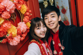 A photo of a young asian couple taking a selfie in front of their door, decorated with spring festival couplets, happy new year image