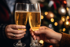 A close up photo of two people clinking glasses of champagne on christmas, happy new year image