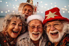 A close up photo of older people celebrating new years eve together at the beach, happy new year image hd