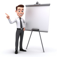 A photo of a businessman cartoon character with a large whiteboard that explain plan, cartoon character and illustration