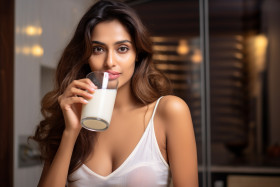indian young beautiful woman drinking glass milk kitchen home portrait smile happy fresh healthy delicious nutritious calcium vitamin protein minerals energy breakfast lunch dinner snack beverage food drink lifestyle culture tradition family friends love happiness joy peace life india asia world people communityImagine Buddy