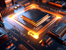 A photo of a glowing computer chip izes modern technology innovation, finance stock photo