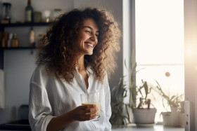 Picture of a smiling woman having a cup of tea from a glass mug, food and drink at home image