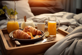 breakfast bed hotel room cozy tray food drink coffee tea juice eggs bacon sausage toast fruit yogurt cereal pancakes waffles pastries orange juice coffee mug teacup silverware napkin table flowers window sunlight view relaxation luxury vacation getaway indulgence pampering treat romantic special occasion weekend getaway honeymoon anniversary birthday celebration indulgence lazy morning day off relaxationImagine Buddy