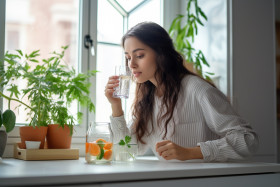 A picture of a young woman drinking water from a glass in her kitchen, food and drink at home image
