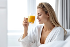 woman pajama white shirt bed breakfast orange juice rest relax bedroom lounge home own room hotel wake up dream lost good mood day young side view eat drink female cozy morning comfort relax leisure time off vacation holiday hotel room bedroom suite brunch breakfast in bed lazy day self-care well-being happiness serenity peace bliss content contentment enjoyment indulgenceImagine Buddy