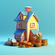 A photo of a stack of coins with a house on top of it, home loan stock image