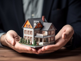 A photo of a concept of mortgage by house in hand with, home loan stock image