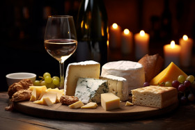 A picture of a wine and cheese pairing that was provided during a gathering in a bar or restaurant, food and drink at home photo