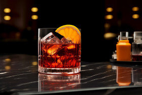 A glass of ice water with an orange twist on a marble table in a dark room, food and drink at home photo