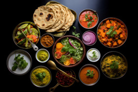 A photo of indian food and many different mexican dishes, food and drink at home photo