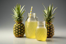 fermented pineapple beverage tepache reuse glass bottle metal straw pitcher gray background drink food healthy probiotic natural refreshing summer tropical sweet tangy fizzy bubbly sparkling delicious tasty refreshing sustainableImagine Buddy