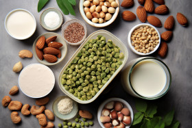 A picture of different vegan plant milks and their ingredients, food and drink at home image