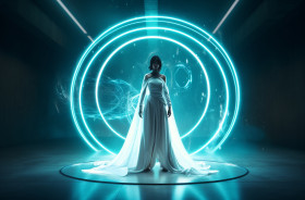 lady circular light frame standing circle woman female portrait beauty fashion model pose people person human art artistic creative photography photo image portraiture headshot full-body studio indoor spotlight illuminated bright glowing halo circle of light halo of light rim light backlighting backlight rim light effectImagine Buddy