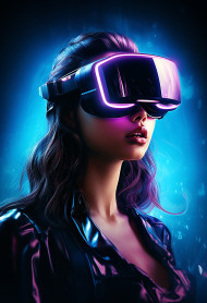 Woman wearing virtual reality glasses that glow with neon light, futuristic image