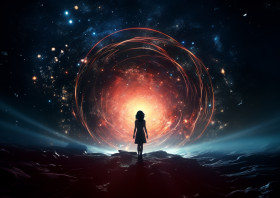 Video of a girl walking through a dark hole with a star, futuristic image