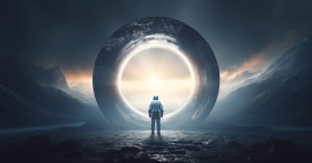 A space traveler is standing outside on the edge of a round sunlit circle, futuristic image