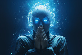 A blue-headed and blue-handed person on a blue background, futuristic image