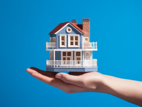 A hand holding a house with a blue background, home loan stock image