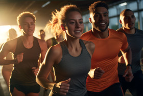 A photo of a group of different runners running fast in a parking garage, with the sun shining through a window behind them, indoor sports and leisure activities images