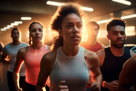 A photo of a group of different runners running fast in a parking garage, with the sun shining through a window behind them, indoor sports and leisure activities images