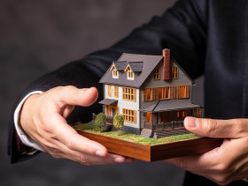 A photo of a hand holding a house new offers in the real estate market, home loan stock image