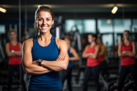 Picture of a smiling coach with her arms folded, standing in the gym and looking at the camera, indoor sports and leisure activities images