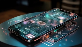 A photo of a phone on the table of the future transparent invisible mobile hologram graph artificial intelligence metaverse and digital technology innovative future data network, finance stock photo