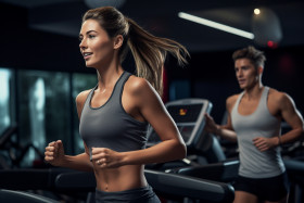 A picture of two young people exercising on a treadmill in a modern gym, indoor sports and leisure activities images