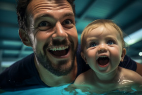 swimming coach baby pool funny swimming lessons baby swimming laughing playing having fun water summer vacation family love happiness joy cute adorable sweet innocent precious splashing swimming cap swimsuit goggles floatie noodles toys rings kicking arms legs smile laughter happy healthy active safety learn grow memories bond togetherness connectionImagine Buddy