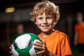 Picture of a young boy with a soccer ball inside, indoor sports and leisure activities images