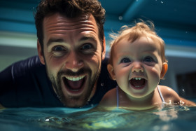 A picture of a swimming teacher and a baby having fun in the pool, indoor sports and leisure activities images