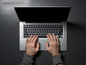 A hand in laptop typing in top view of computer with some on office desk, seo stock images for marketing campaigns