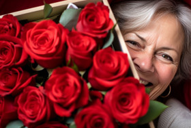 happy mother day grown up child looking camera cuddle hug give flower gift box red heart card mature mum love family bond happiness appreciation celebration togetherness special precious cherished memories grateful blessed thankful fortunate lucky blessed joy laughter happiness love affection warmth care comfort support tenderness nurturing bond connection thanksgivingImagine Buddy