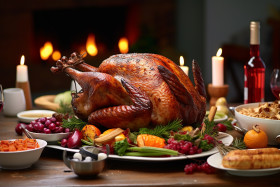 happy thanksgiving feast family friends food togetherness gratitude blessed harvest turkey ham stuffing mashed potatoes cranberry sauce pumpkin pie apple pie dinner table chairs plates silverware glasses wine water juice centerpiece candles flowers napkins placematsImagine Buddy