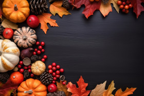 thanksgiving background decoration dry leaves red berries pumpkin blackboard autumn fall flatlay topview copy space holiday seasonal harvest nature abundance gratefulness feast dinner family friends food home cozy warm inviting rustic vintage chalkboardImagine Buddy