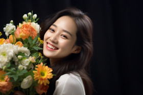 Picture of a happy asian woman with flowers