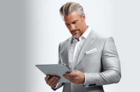 A man points at a tablet computer, seo stock images for marketing campaigns